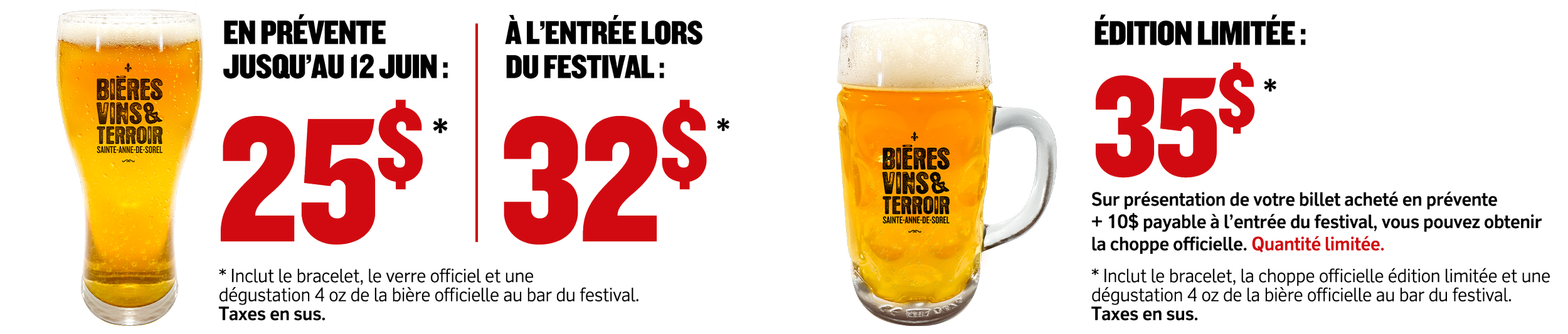 Échangeables pour obtenir le verre officiel du festival et le bracelet, obligatoires pour déguster les bières, vins et spiritueux.